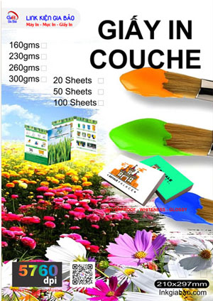 Giấy Couche Là loại giấy in có bề mặt trắng mịn rất phổ thông. Có 2 loại giấy couche trên thị trường, Couche bóng và Couche matt. Couche bóng là loại giấy in thường dùng cho máy inOffset (Máy in công nghiệp). Hoặc cũng có thể dùng mực Pigment UV để in. Loại thứ 2 là giấy Couche Matt: Loại này bề mịn và mềm hơn. Đặc biệt in được trên tất cả các loại mực in liên tục dành cho máy in Epson.