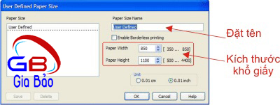 + Chọn khổ giấy có sẵn hoặc bạn tự chỉnh khổ giấy như hình A & B.