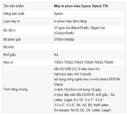 Máy in phun màu Stylus Photo Epson T50 là một máy in đơn chức năng giá hợp lý chuyên xử lý in hình ảnh tốt và có thể in tốt  đĩa CD/DVD, Chi phí tiêu hao liên tục và chất lượngvăn bản cho máy in phun rất thấp.